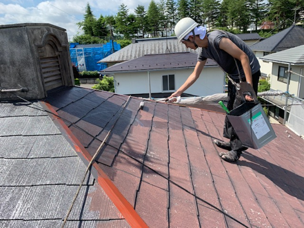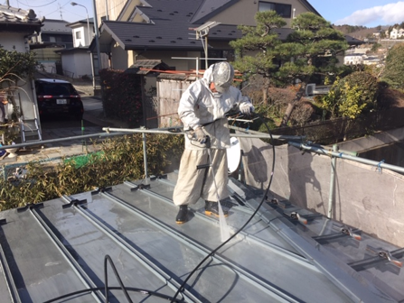経年で屋根に付着している汚れと密着の悪くなっている旧塗膜の剥離の為、高圧洗浄機による洗浄作業をいたします。 (鉄系屋根の場合は洗浄前に研磨作業)